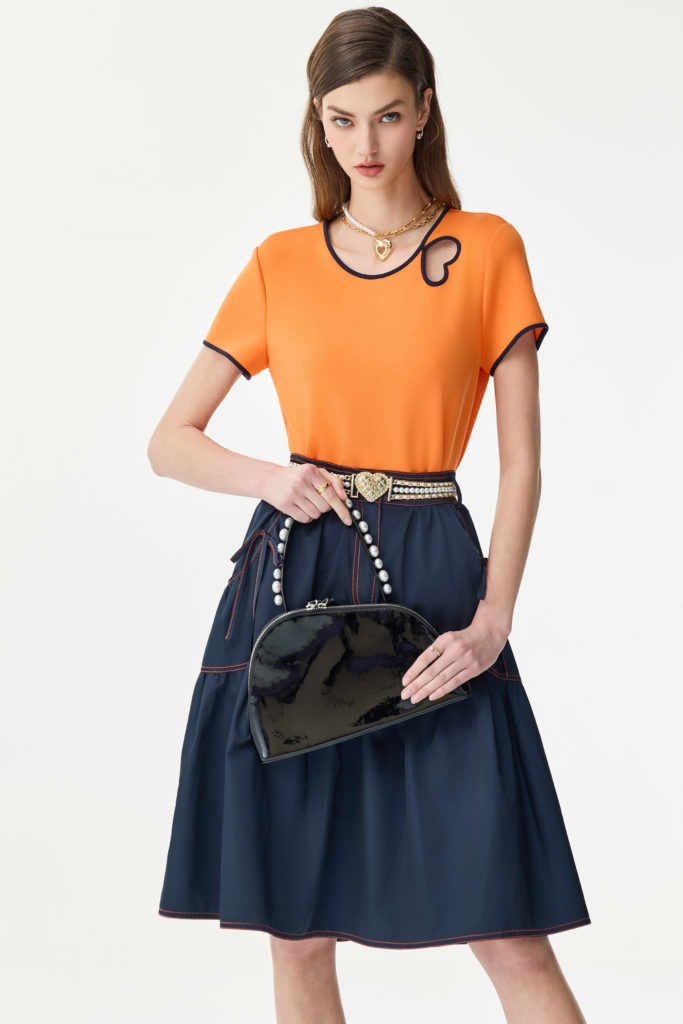 本週以溫暖琥珀色明顯妝點偽牛仔面料,從細節處打造全新視覺感受。採用舒適輕盈面料仿造經典丹寧的視覺效果,並透過明線車縫工藝的巧妙改造,形成對比鮮明的輪廓線條,讓經典單品煥發俏皮印象,也巧妙呈現摩登與復古風格的完美交融。