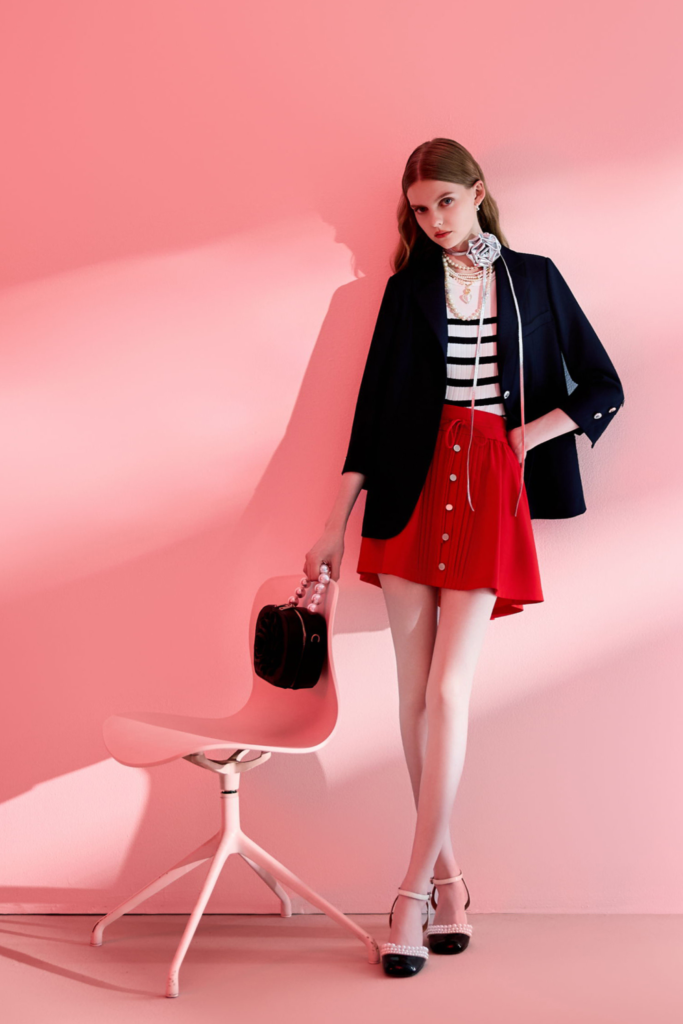 白底條紋上衣搭配深藍西裝外套,休閒中帶有正裝專業度,下身選擇摺線排釦火焰色澎裙,巧妙為穿搭增添熱情活力,整套以海軍代表色搭配出完美平衡。
