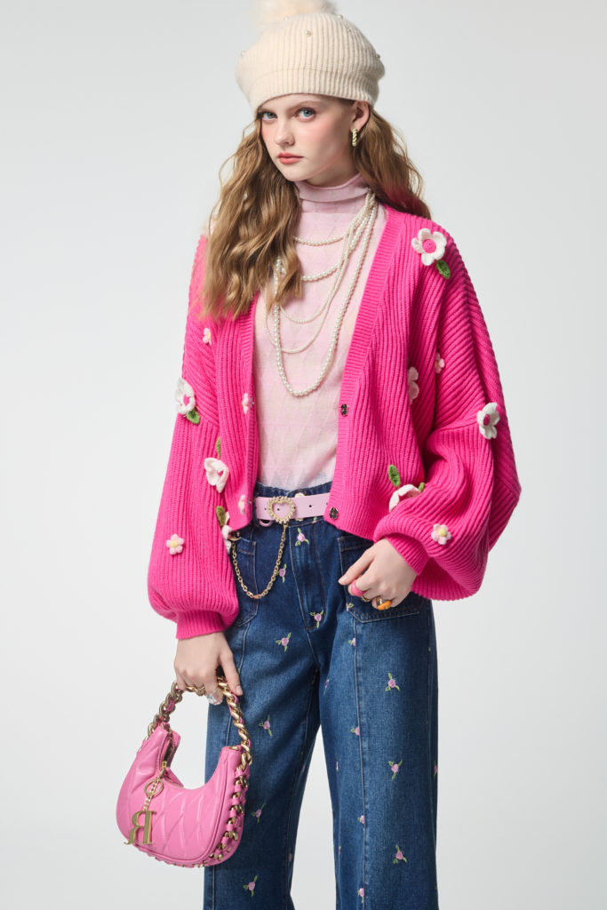菱格針織上衣搭配花卉鈕釦外套展現輕盈層次感,以溫柔姿態勾勒出秋冬的浪漫輪廓。丹寧上的花朵刺繡細節,為粉色調注入理性氣息,在柔美與俐落之間達到完美平衡。