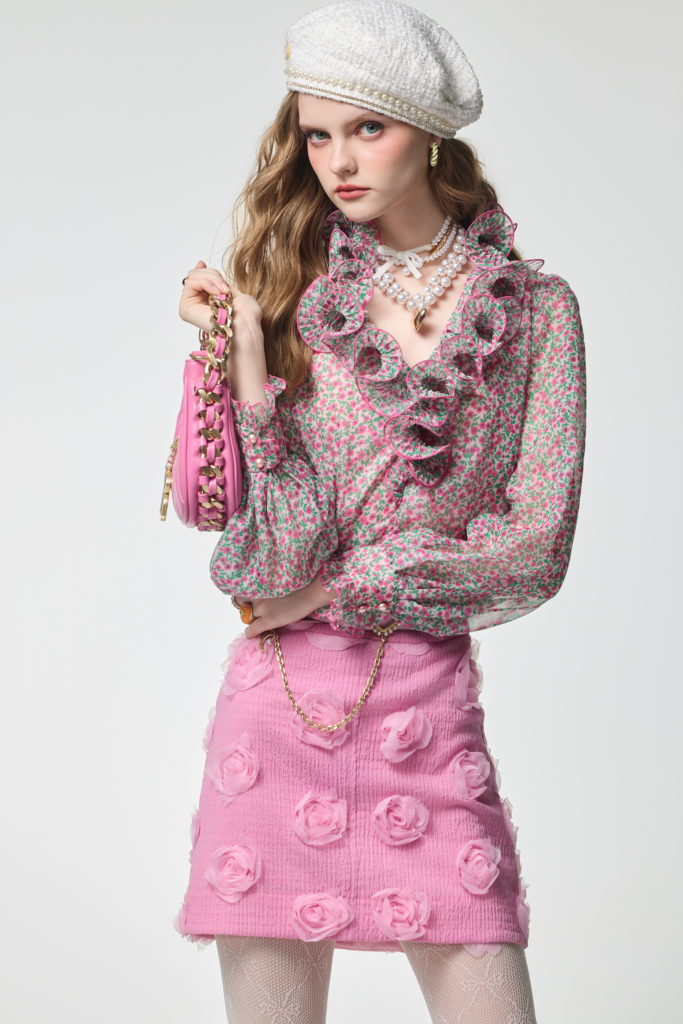 以輕盈雪紡材質結合碎花印花,搭配波浪荷葉領及澎袖營造出浪漫優美輪廓,下身配上石英粉A字短裙,立體玫瑰花裝飾為整體增添輕快夢幻少女感,約會或是聚餐穿上即刻吸引眾人目光!