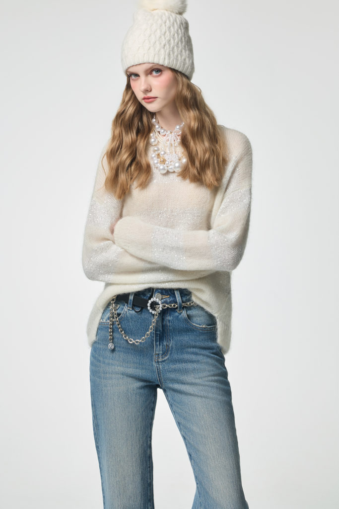 針織上衣以溫柔色調帶出淡雅暖意,細緻毛絨感讓秋冬造型多了輕盈亮度;下身搭配經典丹寧褲,平衡柔軟質地與日常實穿度,展現舒適又不失精緻感的季節穿搭。