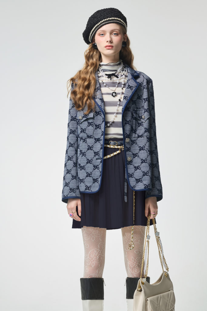 西裝外套以多層次藍調勾勒蝴蝶結織紋,低調卻不失精緻華麗;內搭的條紋高領上衣以濃靛藍與蒼穹黃撞出視覺亮點,與細百褶短裙組成俐落而輕盈的下身比例,整體造型在優雅與個性之間取得完美平衡!
