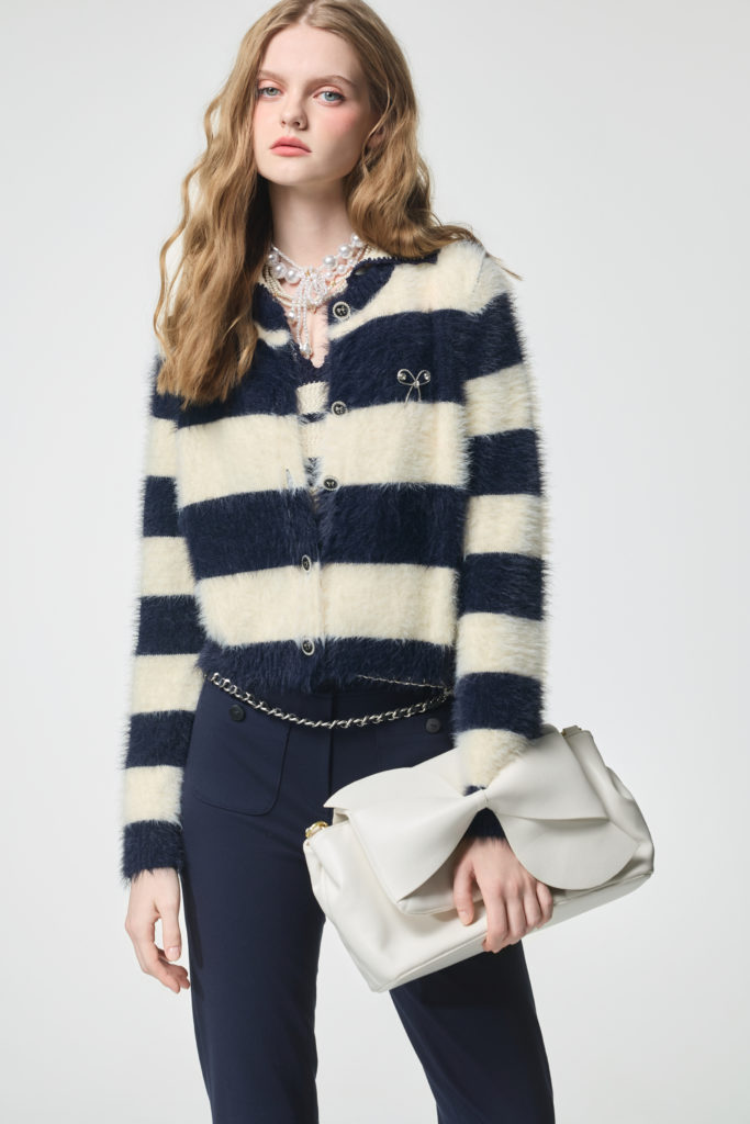 寬版條紋針織衫,運用仿水貂毛面料及蝴蝶結細節點綴為休閒風格增添柔美氣質,搭配濃厚靛藍造型長褲完美修身,是都會通勤時舒適又不失風格的完美搭配