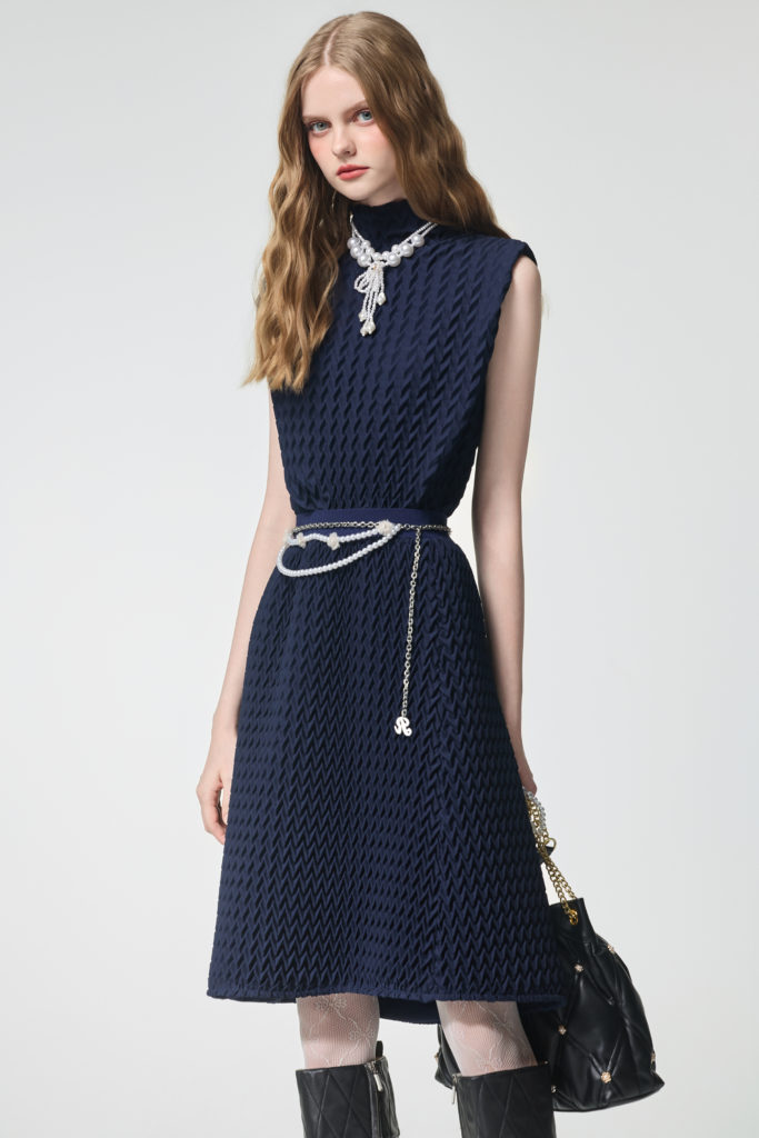 以特殊面料結合立體壓紋,讓靛藍色成套穿搭充滿細節,高領、無袖的剪裁設計更易於隨著氣溫調整穿搭方式,完美展現女性的柔美與自信。