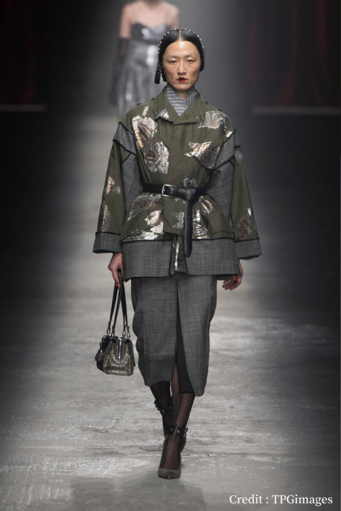運用神秘綠、月光灰的多層次解構外套,以不同面料拼接出服裝的趣味性,像是畫筆揮灑的圖案與正裝格紋結合,更展現出新潮的設計邏輯,令人印象深刻。
