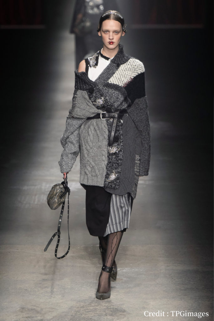 由多層次灰調與異材質織法拼接而成的針織外套,一件重點單品就足以勾勒時髦態度;搭配腰帶強調比例、再配上同色系包款與跟鞋,整體造型低調卻極具品味。