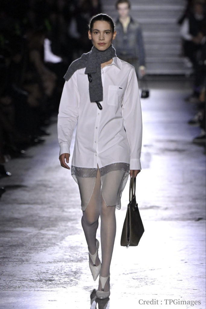 以光學白、月光灰及薄暮灰,及襯衫面料、蕾絲、薄紗等異材質拼接打造的長版襯衫洋裝,正式中又帶有細節巧思,搭配灰系絲襪、圍巾等配件,讓穿搭呈現十足時髦都會感。