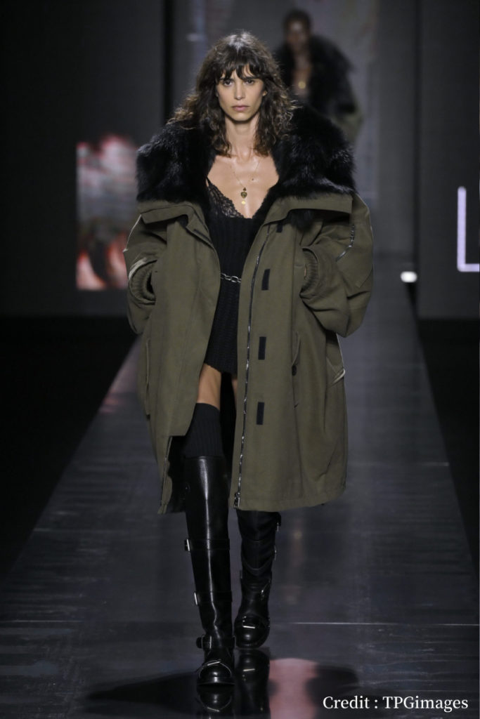 神秘綠長版夾克外套,採用硬挺面料及俐落剪裁,搭配仿皮草大翻領設計,讓整體充滿氣勢與份量感,搭配上長靴更展現出帥氣態度!