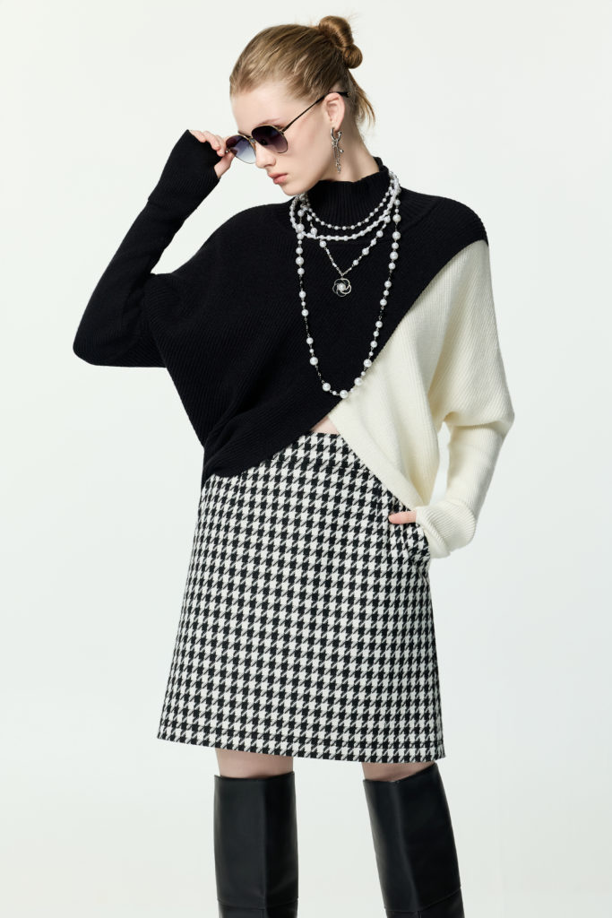 黑白拼接高領針織上衣搭配小千鳥格短裙,呈現出冬季溫暖柔軟的氛圍,運用珍珠項鍊及長靴完成造型,就能穿出溫柔優雅且適合都會通勤的完美穿搭,都會通勤到晚間聚會都很適合,在低調中透露高級品味!