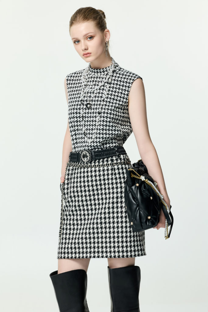 小千鳥格圖騰典雅細緻,在視覺上更加修身,結合毛呢面料打造出俏麗高領成套裙裝,俐落剪裁不僅優雅也同時給人幹練專業感,除了材質溫暖親膚,再運用巧思搭配珍珠及皮鍊飾品,更為造型大大加分。