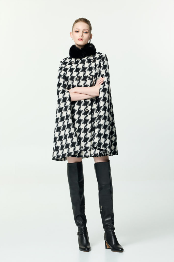 冬日裡最能輕鬆營造存在感的,非斗篷式外套莫屬。iROO 以俐落大千鳥格重新詮釋這件冬季經典,放大圖騰的節奏感,使整體線條更具視覺亮點。活動式毛毛領則在保暖之外增添一抹柔軟的趣味,搭配一雙過膝長靴,瞬間轉化為帶著瀟灑步伐的法式女伶氛圍。