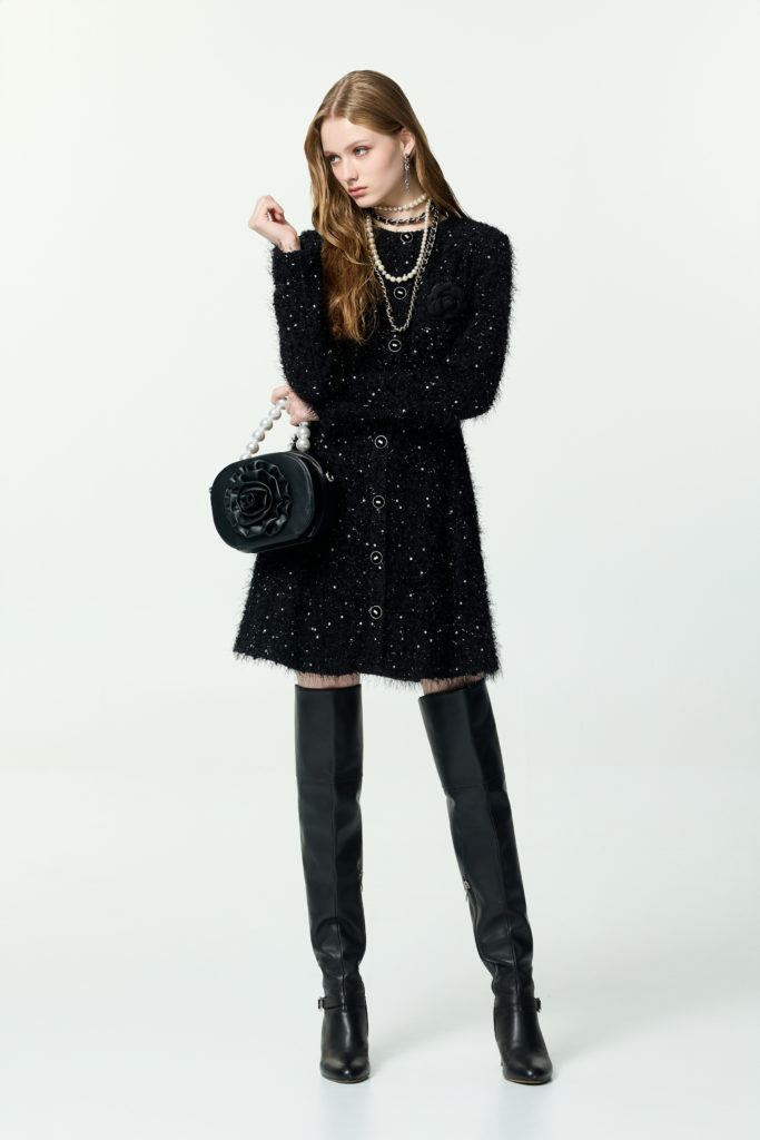 嵌有細緻亮片的閃閃毛呢短洋裝,細微光澤在光線下若隱若現,修身剪裁也打造出完美比例,低調卻不凡,運用光影、材質與剪裁打造都會摩登的輕奢高級感。
