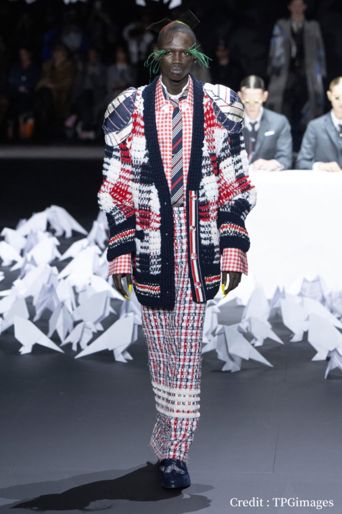 設計師將濃厚靛藍、火焰紅與光學白交織成大小格紋,打造出寬版針織衫及窄版長裙,再搭配紅白格襯衫及條紋領帶,就像在對世人展示極佳衣著品味,整體造型堆疊出立體層次與高級風格,展現品味穿搭教科書般的質感。
