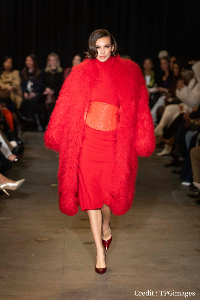 搶眼的火焰紅運用於毛毛面料及皮革,讓整身紅的搭配中更有層次與細節,皮革馬甲塑造出完美比例,是適合出席派對的華麗裝扮。