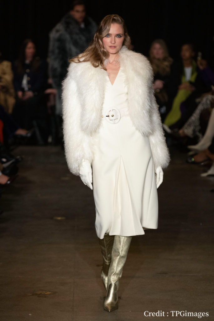 純淨的光學白則為冬裝注入一股清新,絨毛面料的華美外套營造出貴氣感,搭配V領打摺洋裝,優雅中展現自信魅力。