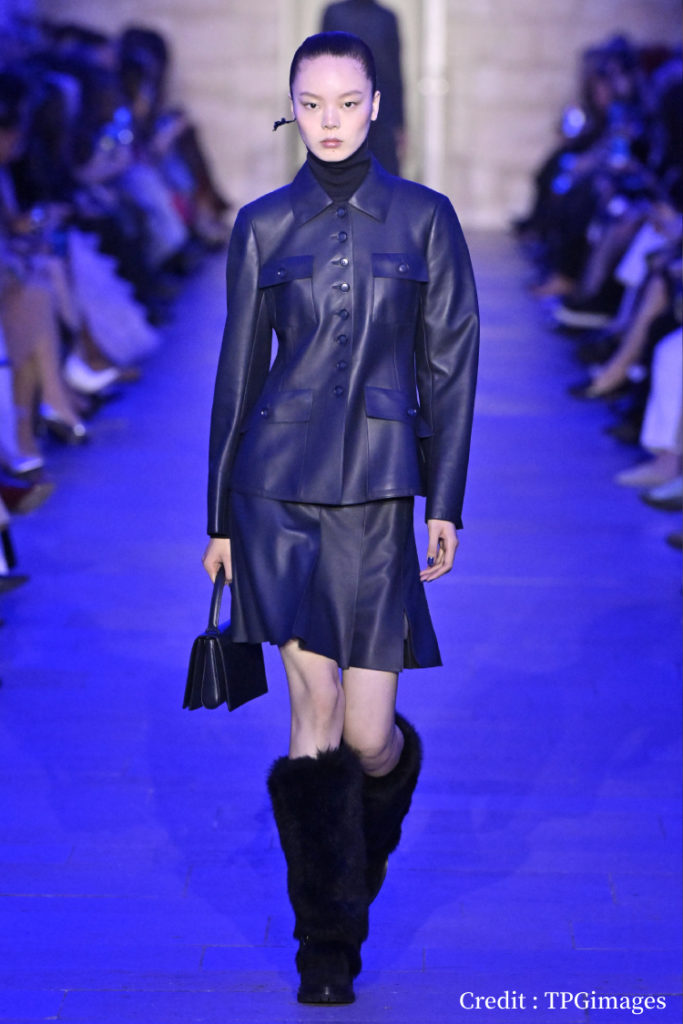 將濃厚靛藍與皮革結合,以彷彿西裝外透的細膩剪裁搭配不規則皮裙,不只修飾身形更讓造型前衛摩登。