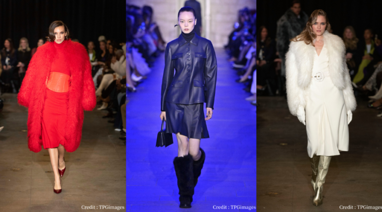 火焰紅展現冬季能量,靛藍傳達深邃與沉穩,而光學白則象徵冬日的白雪與晨光,將三大主色調結合不同面料,能讓整體造型精緻高級且充滿年末節慶的華麗氛圍。