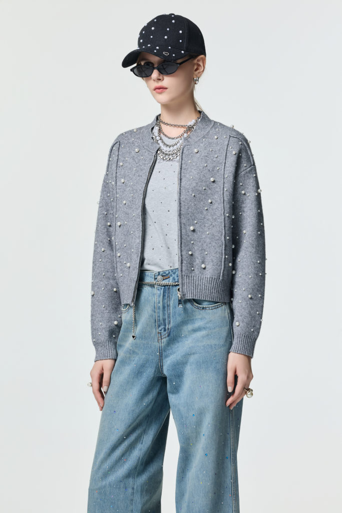 以棒球外套輪廓為基底,融入大小珍珠點綴,使休閒外型添上一抹浪漫氣質。搭上鑲水鑽的淺色丹寧與水鑽帽,以率性× 閃耀的混搭語彙,展現女性自信姿態,釋放低調華麗的光澤魅力。