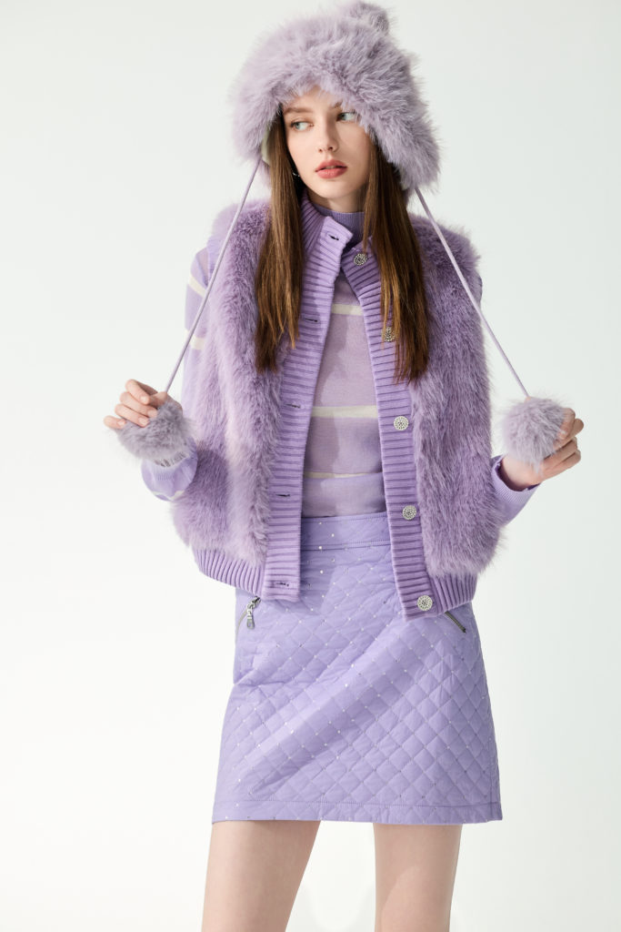 將針織融合絨毛拼接的薰衣草紫背心,柔美奢華又充滿造型感,搭配同色細針織條紋上衣及絎縫面料窄版短裙,菱格紋縫線上多了細膩亮鑽裝飾,優雅華麗,讓整體造型充滿細節與品味。
