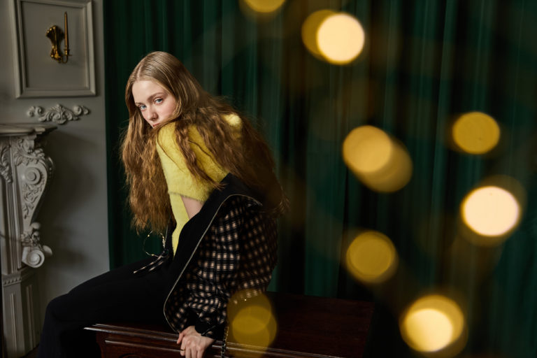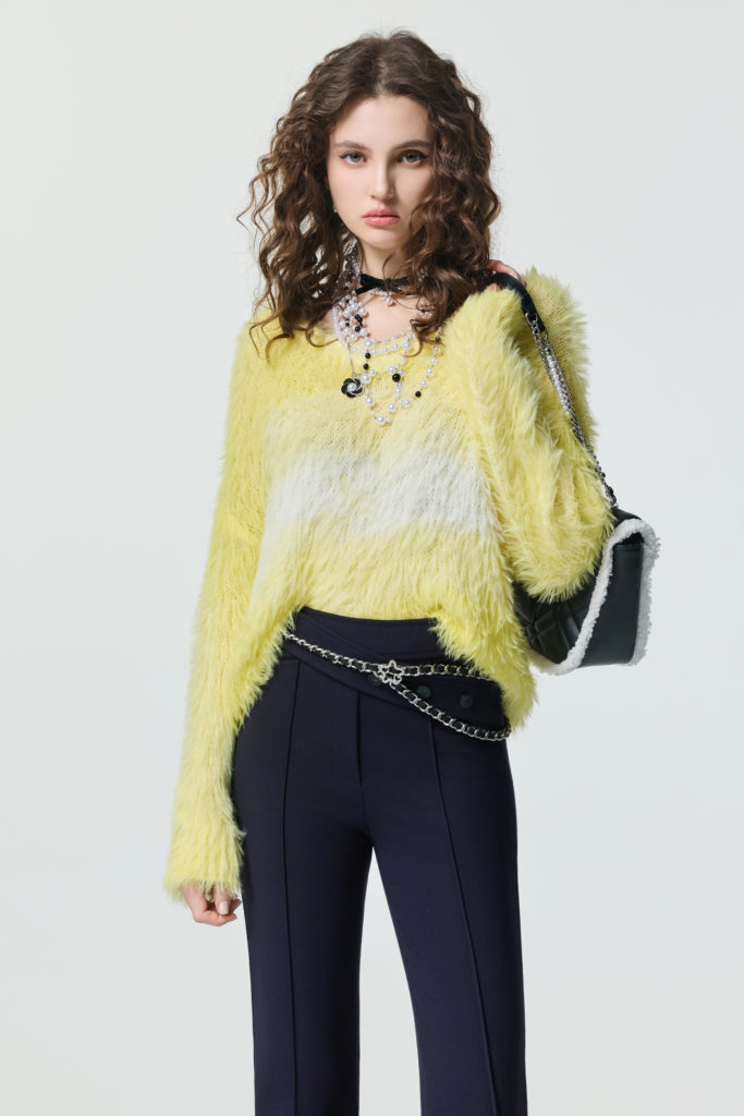漸層萊姆黃長毛針織上衣以落肩、寬鬆版型打造出冬日溫暖舒適的慵懶態度,搭配珍珠、花朵元素配飾及高腰修身西褲,讓整體造型不過於休閒,反而更展現出精緻都會時髦感。