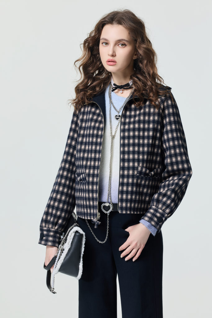 以月光石藍漸層針織搭配兩穿式海軍藍格紋翻領外套,藍調為視覺帶來完美平衡,蝴蝶結細節與愛心配飾,同時展現帥氣又甜美的穿搭風格。