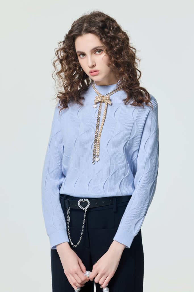 將月光石藍運用在針織上衣,以宛如水波流動感的織紋呈現出動態立體感,儘管下身搭配簡單褲裝也足以展現穿搭的巧思與細節。