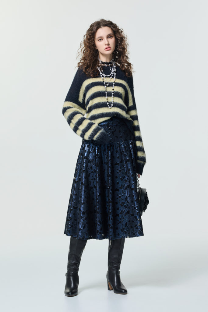 將萊姆黃融入海軍藍中則是撞色搭配中的高級穿法,以海軍藍為底結合萊姆黃粗調紋的長毛針織上衣,搭配帶有光澤感的海軍藍壓花長裙,運用圖騰低調帶出細節,讓深色穿搭更加出眾,完美彰顯都會摩登白領的優雅美感。