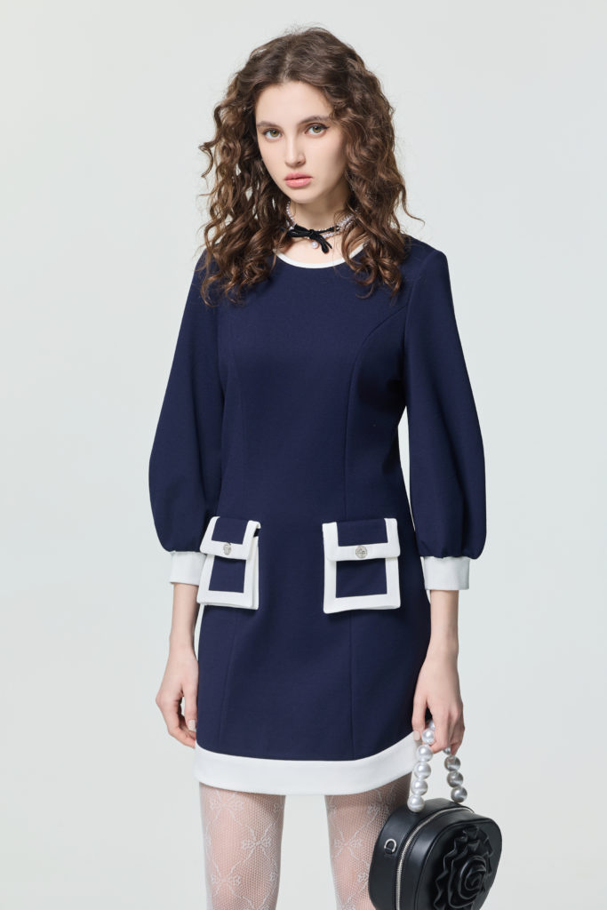 內斂沉穩的深藍色調一直是都會職場中能展現內斂專業氣質的色彩,以海軍藍結合特殊面料打造出立體廓型洋裝,袖子的澎袖輪廓與波浪裙擺造型,搭配上粗條純白滾邊,散發端莊優雅氛圍!