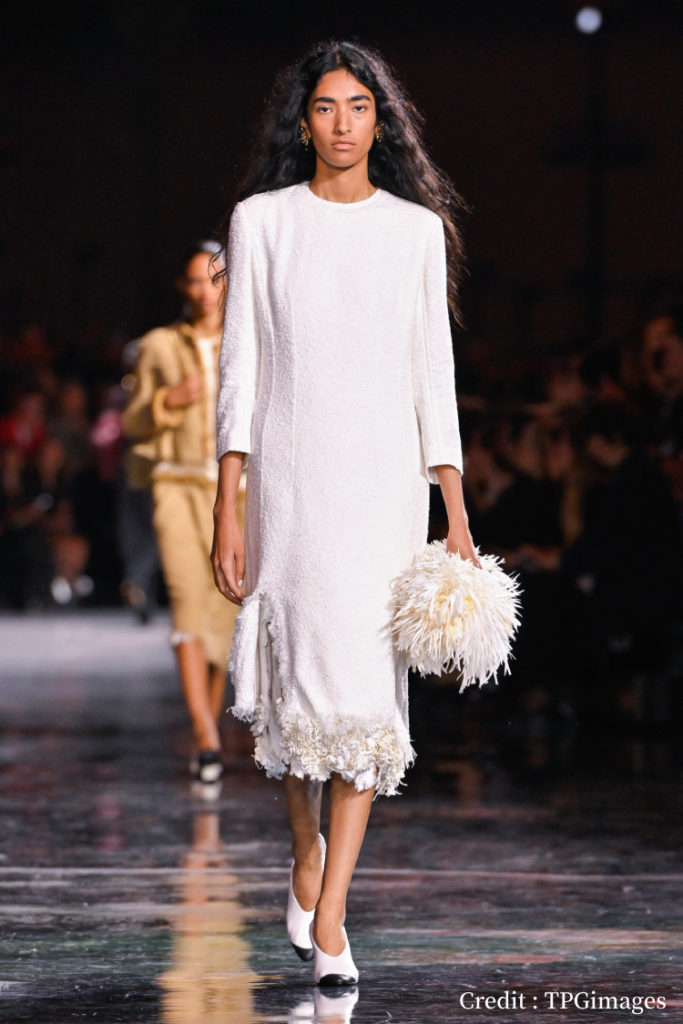 以毛呢面料打造純白連身洋裝,透過細緻車線打造出立體輪廓,開岔設計及宛如花朵盛開般的裙擺,不僅充滿春日氛圍,呈現出都會女性從容的自信姿態,在清新春日氛圍中展現都會女性的從容姿態。
