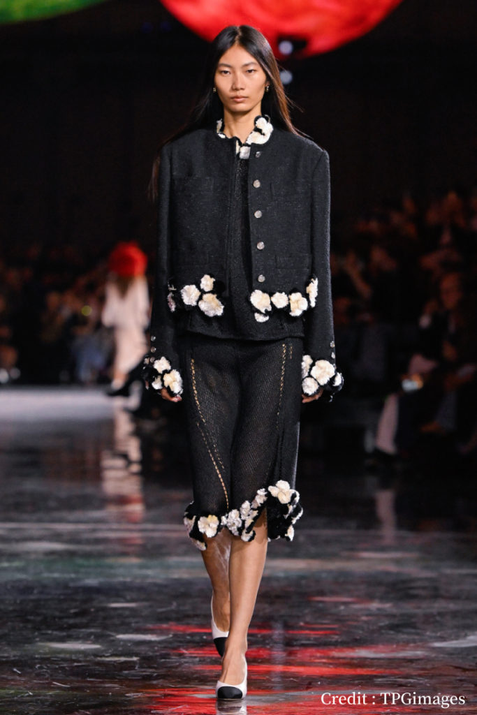 黑色毛呢套裝採用帶有細膩光澤感的厚實面料,在領口、袖口及衣襬、裙擺點綴白色立體花朵裝飾,為沉穩黑色注入柔美層次,精緻細節勾勒出低調卻不單調的優雅氣質,展現成熟女性的自信魅力。