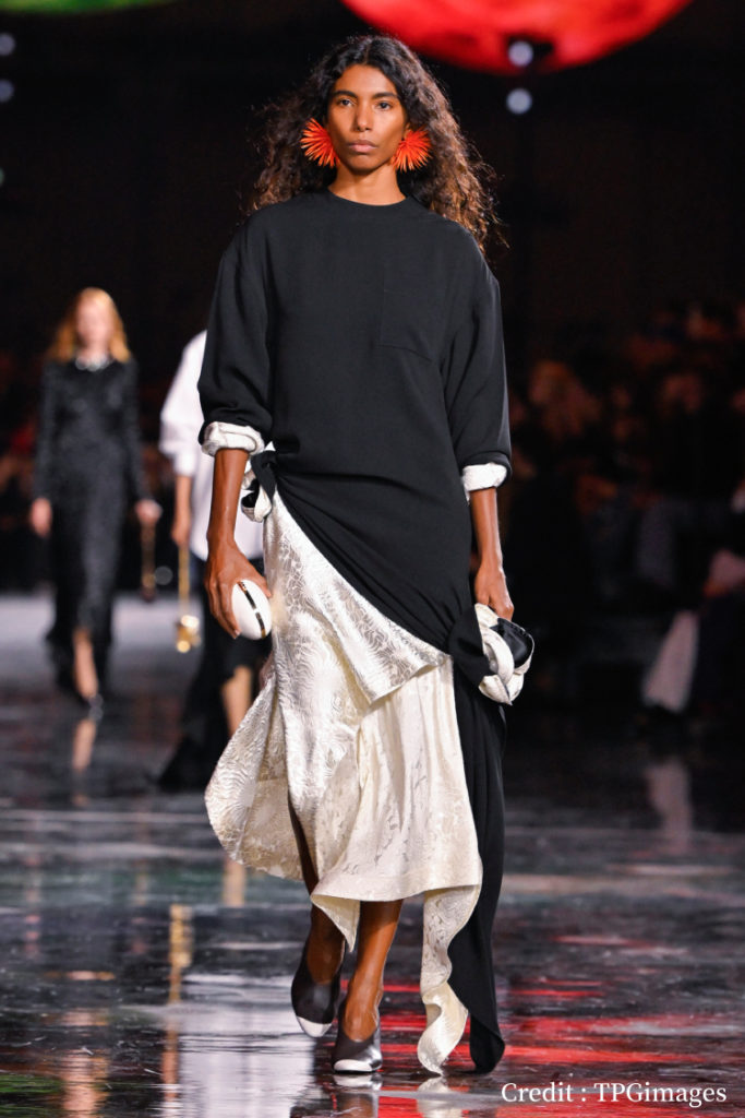 以黑白不規則長版上衣疊搭,再搭配金屬光澤圖騰面料,讓視覺充滿層次,俐落的垂墜感隨著步伐擺動同時也呈現出慵懶輕鬆的自信姿態。