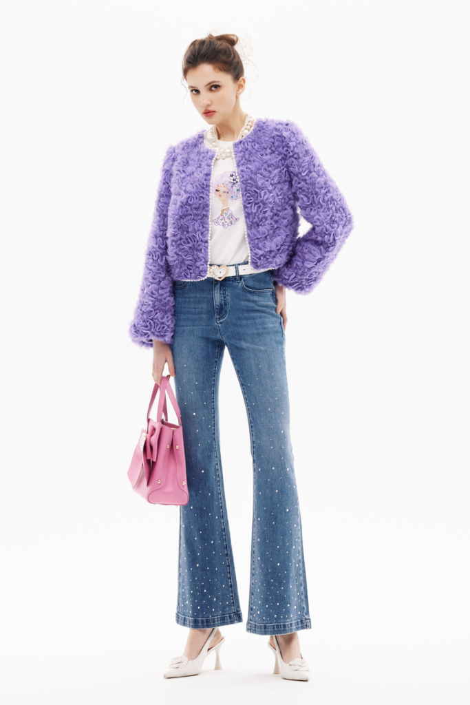 以空氣感立體褶皺面料打造的柔紫廓型外套,宛如春日花朵盛開的視覺效果不只讓穿搭帶有趣味性同時也增添份量感,下身搭配微喇叭丹寧褲完美修飾身形,而褲腳的碎鑽裝飾則讓整體穿搭充滿細節,展現女性柔美姿態。