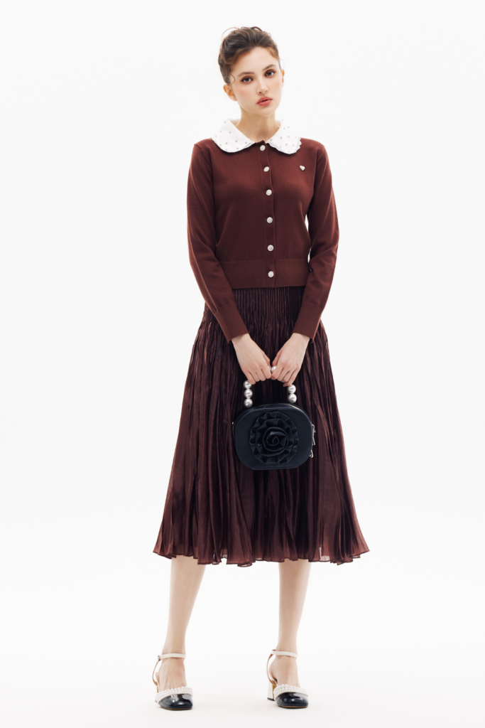 櫻桃巧克力 one tone 搭配將女性的柔美氣質完美演繹,針織開襟衫搭配同色系細摺光澤中裙,異材質的組合讓光感及霧感兩種面料碰撞出細膩層次,穿出大人感十足的知性優雅。