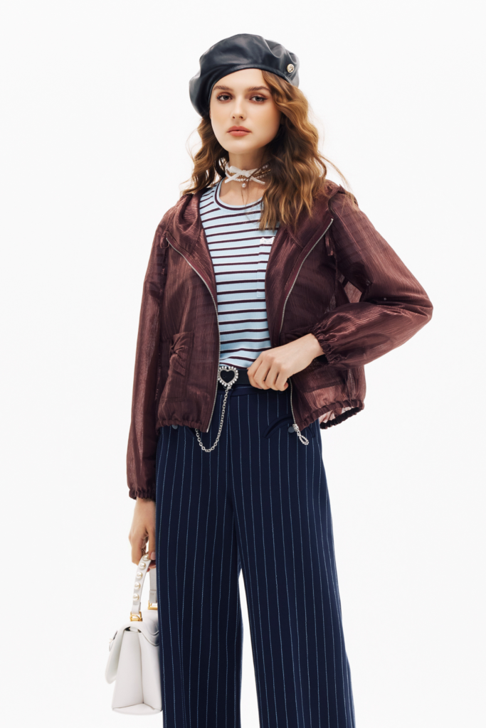 以帶有絲緞光澤的櫻桃巧克力色防風外套,搭配帆船藍條紋造型上衣,巧妙的撞色組合為穿搭注入春日清爽,搭配深藍直條紋刺繡長寬褲在視覺上延伸比例,整體出搭呈現俐落都會時髦氛圍。