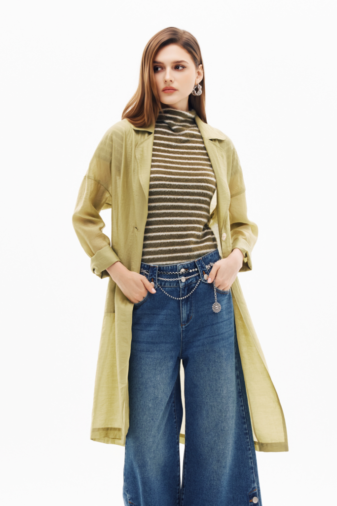 酸橙綠長版透紗外套搭配同色系高領條紋上衣,輕透材質就像套上柔和濾鏡般,為色彩增添層次,下身搭配深藍丹寧寬褲,打造拉長身形比例的同時展現俐落時髦的都會休閒風格。