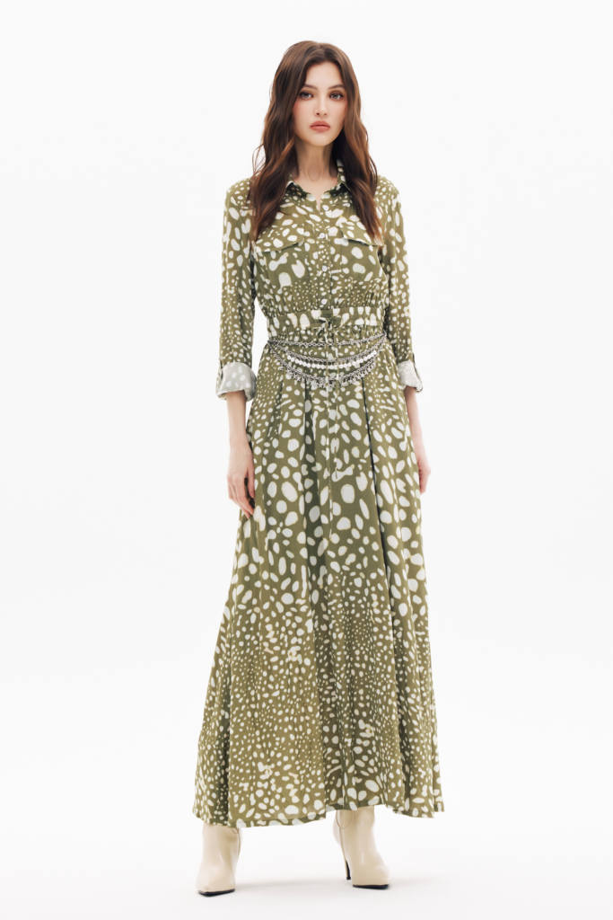 酸橙綠鹿紋襯衫式長連身裙,透過輕薄透紗面料、收腰設計與大裙襬創造線條流動感,大小不一的圓點鹿紋則展現出春日活力,整體造型散發知性從容的優雅姿態。