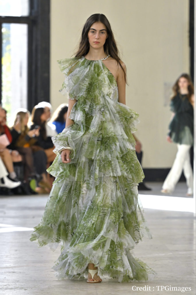 以酸橙綠結合自然叢林印花打造的薄紗長洋裝,運用大量的荷葉邊堆疊出層次,打造出春日花朵綻放般的視覺效果,既浪漫又充滿流動感,一穿上即自帶高雅氣場。