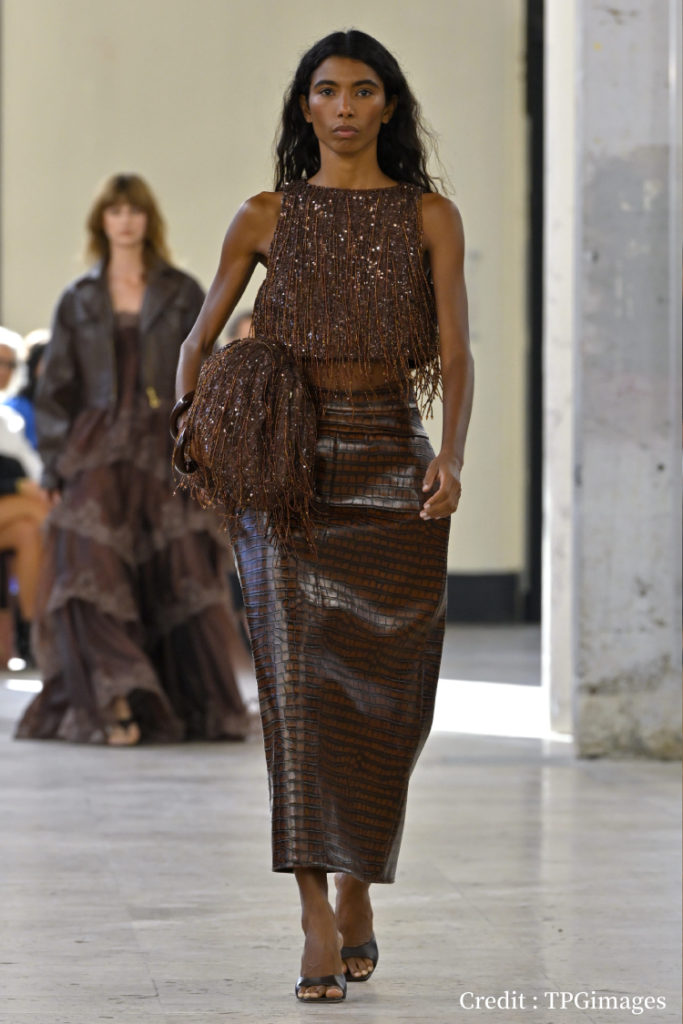 以異材質混搭出充滿大人優雅風格的 one tone 櫻桃巧克力穿搭,上衣運用帶有細微光澤感的流蘇,隨著步伐擺動產生光影流轉的流動感,下身搭配擁有筆挺廓型鱷魚壓紋皮革長裙,透過材質的對比呈現出成熟迷人的洗鍊風格。
