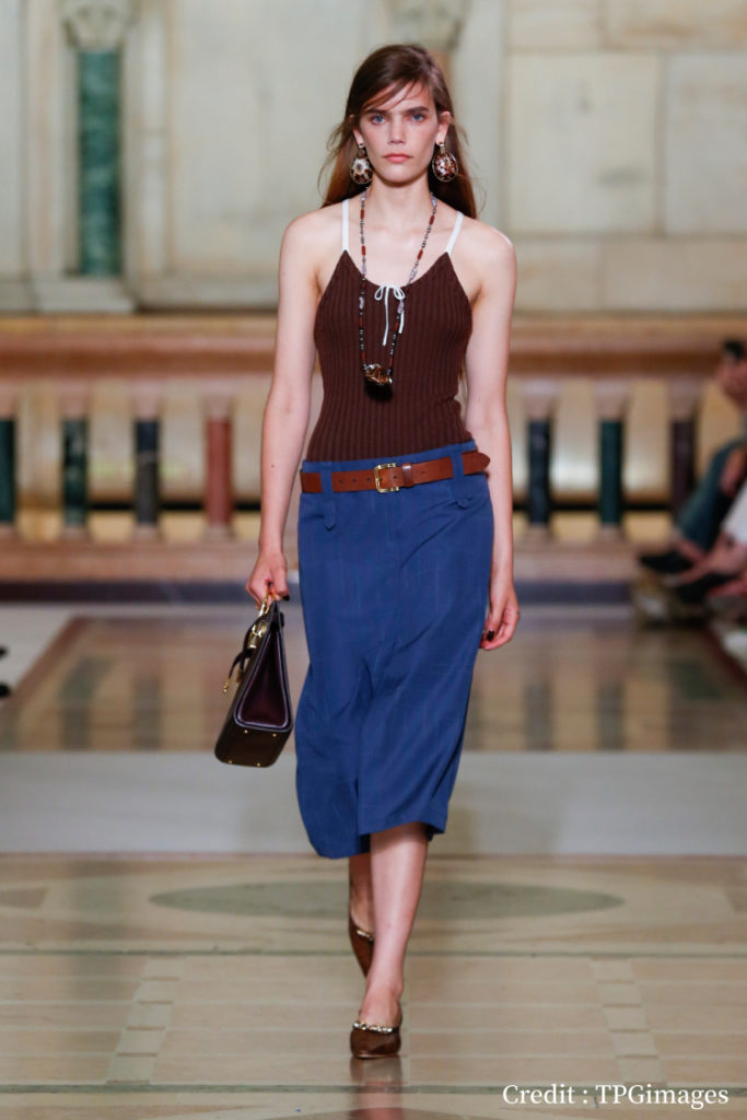 另一套則以櫻桃巧克力與深邃藍的撞色搭配,中和暖色調的甜膩感,形塑自在灑脫的旅行氣場。貼身剪裁的櫻桃巧克力細肩帶針織背心勾勒身形線條,搭配深藍低腰中裙,在不經意之間流露大人感優雅。