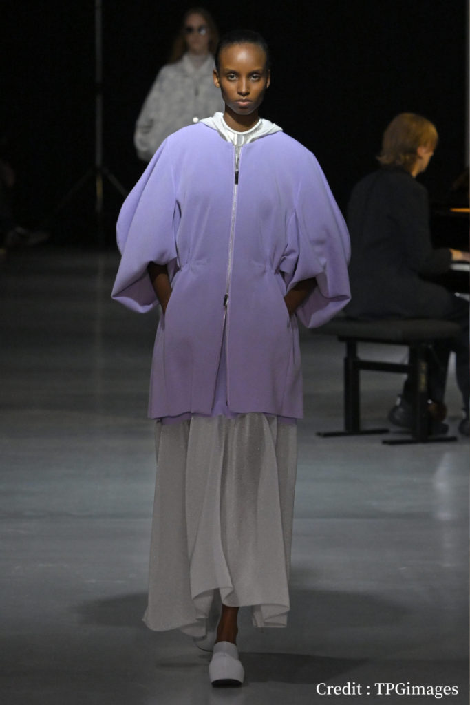 以柔軟面料結合膨鬆袖型與收腰剪裁,讓柔紫色外套展現出線條流動的俐落感,下身搭配純白透紗長裙,更將柔紫色的空靈感完美襯托,營造出春日獨有的爽朗清透風格。